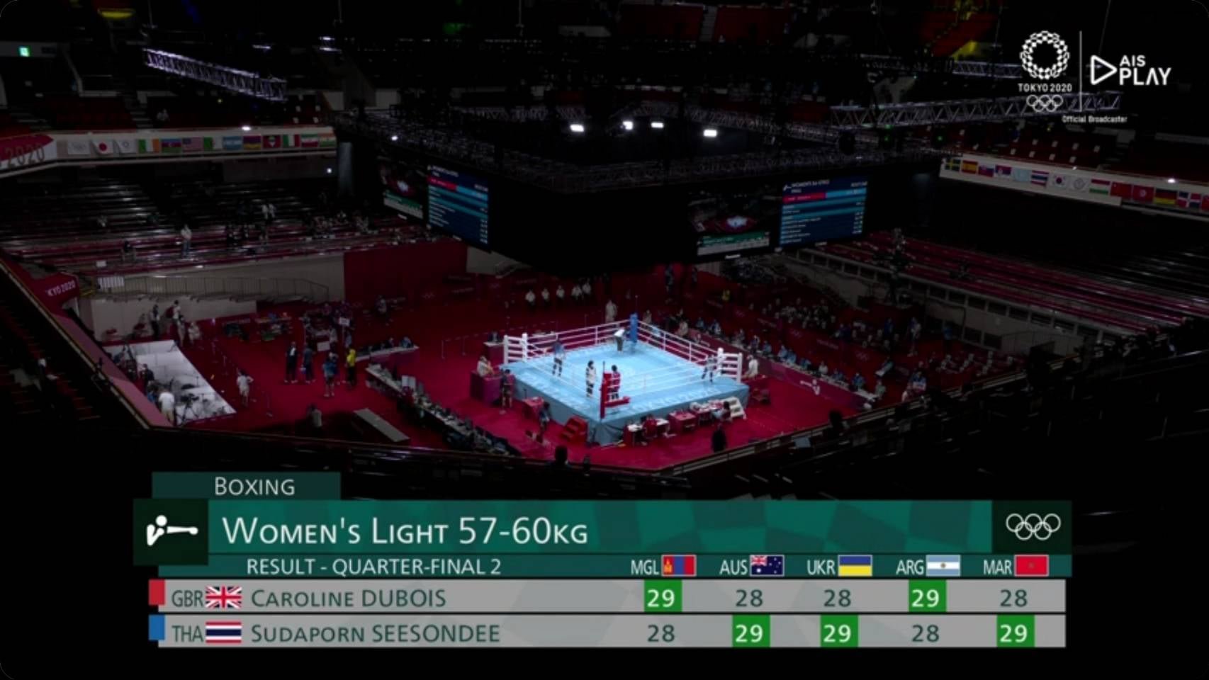 การแข่งขันมวยหญิง ในกีฬาโอลิมปิก โตเกียว 2020 ที่กรุงโตเกียว ประเทศญี่ปุ่น เมื่อวันที่ 3 สิงหาคม 2564 "แต้ว" สุดาพร สีสอนดี เอาชนะ แคโรลีน ดูบัวส์ จากสหราชอาณาจักร ในรุ่น 60 กก.หญิง เข้าสู่รอบรองชนะเลิศเรียบร้อย พร้อมการันตีเหรียญทองแดงเป็นอย่างน้อย
