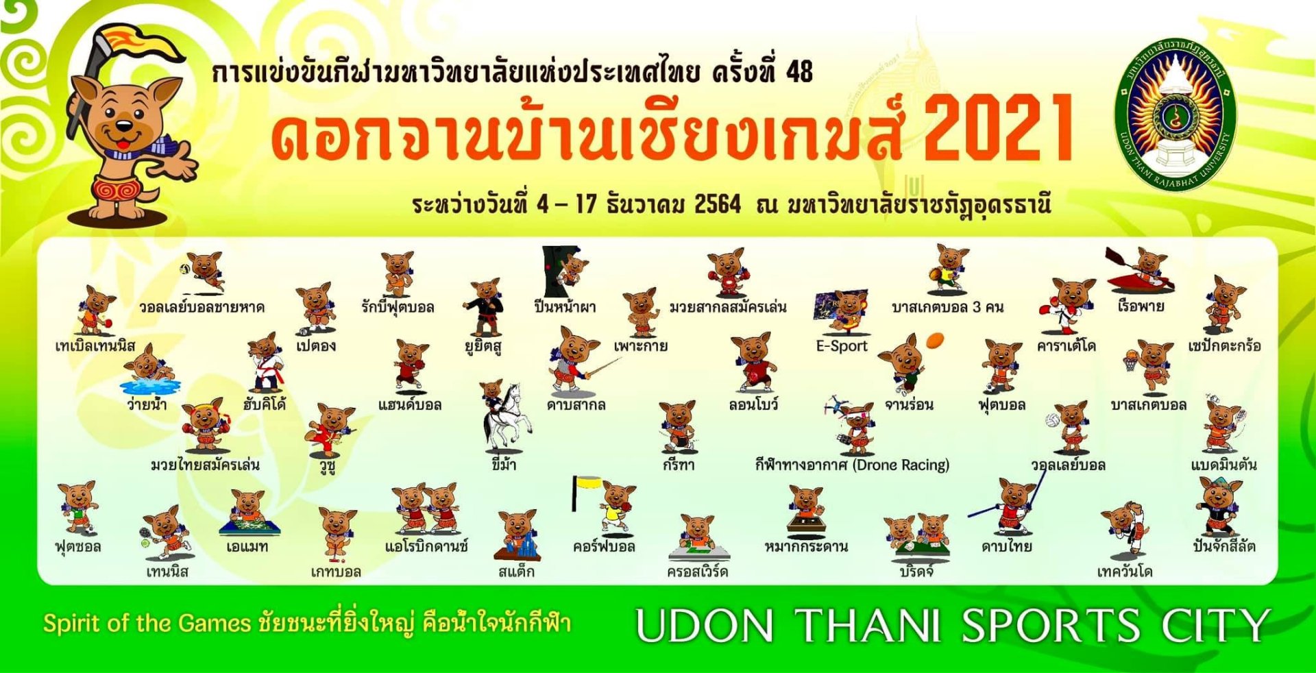 ดอกจานบ้านเชียงเกมส์ 2021 การแข่งขันกีฬามหาวิทยาลัยแห่งประเทศไทย ครั้งที่ 48 มีการชิงชัย 41 ชนิดกีฬา 486 รายการแข่งขัน กับ 4,815 เหรียญรางวัล ระหว่างวันที่ 4-17 ธันวาคม 2564 @ สนามกีฬา มหาวิทยาลัยราชภัฏอุดรธานี