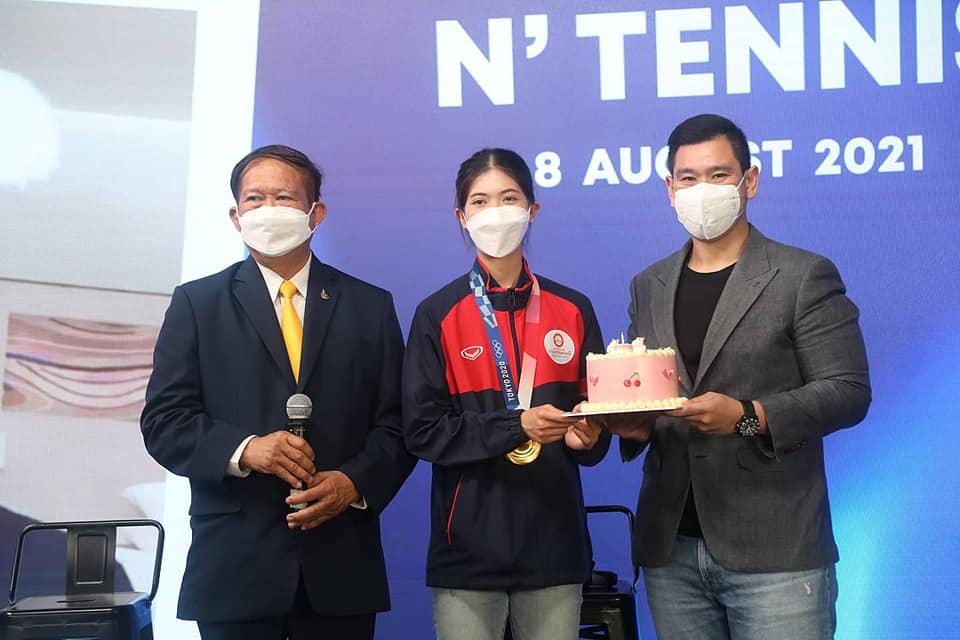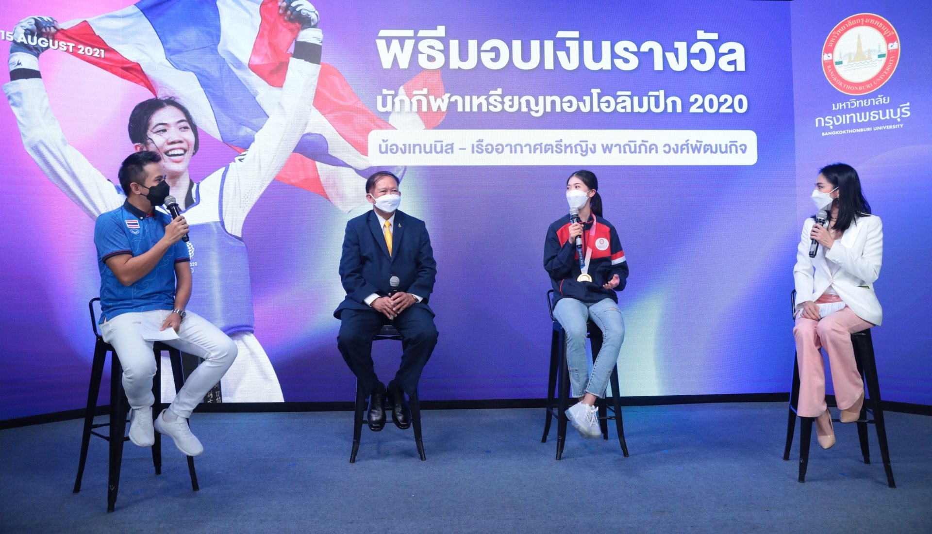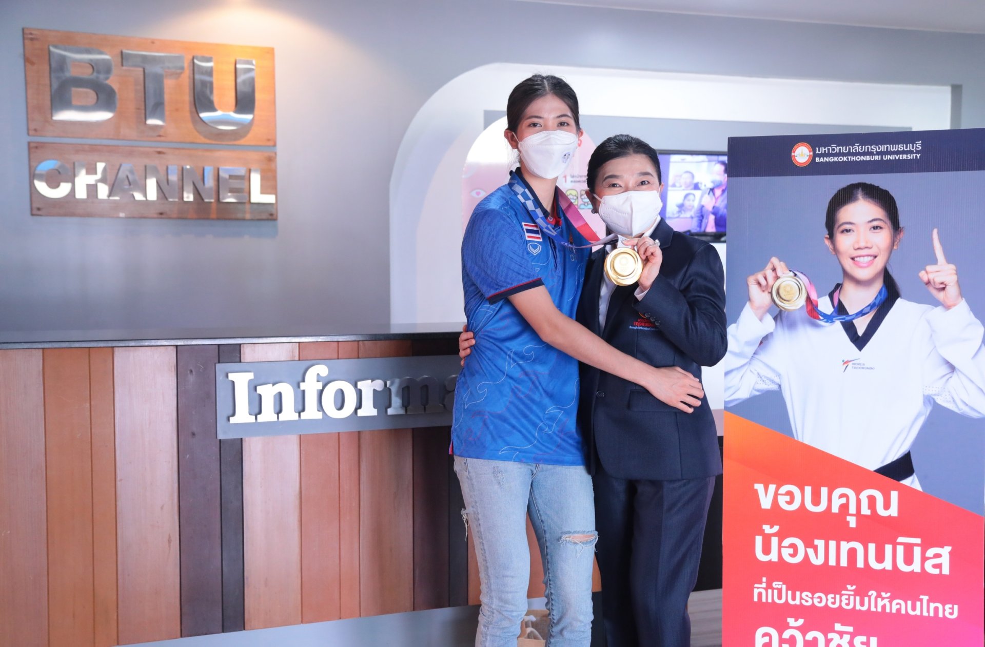 อธิการบดี กล่าวอีกว่า ในนามของชาวไทยคนหนึ่ง ต้องบอกว่ามีความยินดีอย่างที่สุดที่ “น้องเทนนิส” ได้สร้างชื่อเสียงได้ทำเหรียญทองโอลิมปิก 2020 ที่ประเทศญี่ปุ่นมาฝากชาวไทยในครั้งนี้ ในฐานะที่อธิการบดีเป็นอธิการมหาวิทยาลัยกรุงเทพธนบุรี และ “น้องเทนนิส” เรียนในหลักสูตรปริญญาโท รัฐประศาสนศาสตรมหาบัณฑิต พวกเราชาวมหาวิทยาลัยกรุงเทพธนบุรี และสถาบันในเครือฯ ต้องบอกว่าที่สุดฃองความภาคภูมิใจ “น้องเทนนิส” ก็ถือว่าเป็นลูกสาวคนหนึ่งที่ได้ประสบความสำเร็จอย่างยิ่งใหญ่ อันนี้คือ ฮีโร่เหรียญทองของเราในการแข่งขันโอลิมปิก 2020 ที่ผ่านมา