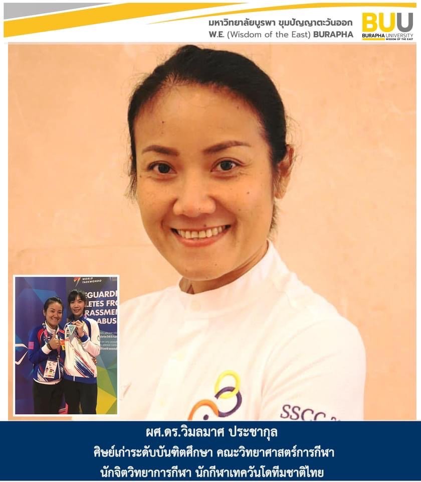 2 ผู้ช่วยศาสตราจารย์ ดร. วิมลมาศ ประชากุล ศิษย์เก่าระดับบัณฑิตศึกษาคณะวิทยาศาสตร์การกีฬา ในฐานะนักจิตวิทยาการกีฬา นักกีฬาเทควันโดทีมชาติไทย