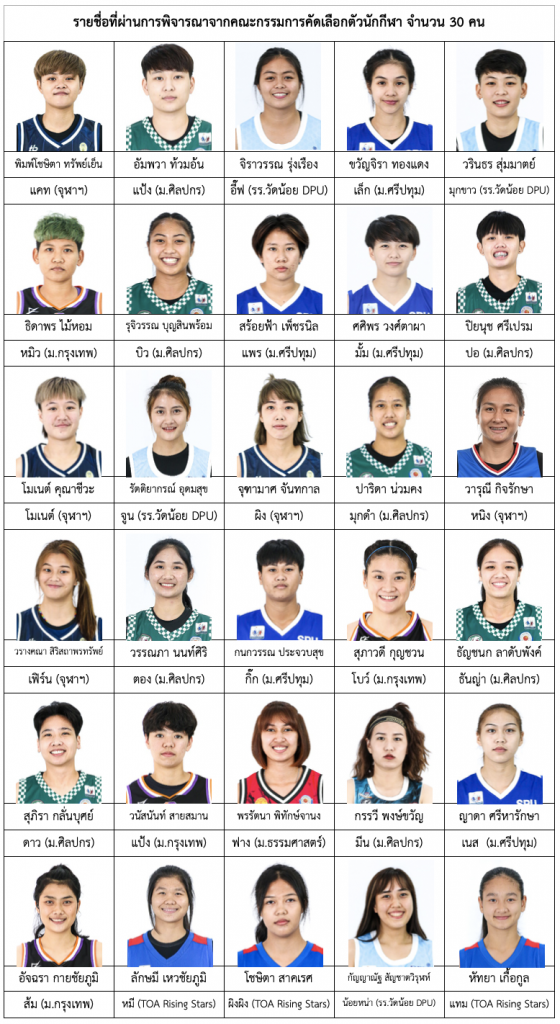 สมาคมกีฬาบาสเกตบอลแห่งประเทศไทย ได้ประกาศรายชื่อนักกีฬาบาสเกตบอลหญิง ที่ผ่านการคัดเลือก (รอบแรก) จำนวน 30 คน โดยเป็นนักกีฬามังกรสาวจากทีม SILPAKORN – SHOOT IT ถึง 8 คน เพื่อเก็บตัวฝึกซ้อมเข้าร่วมการแข่งขันรายการดังกล่าว โดยรายชื่อ 30 คนที่เรียก มีดังนี้