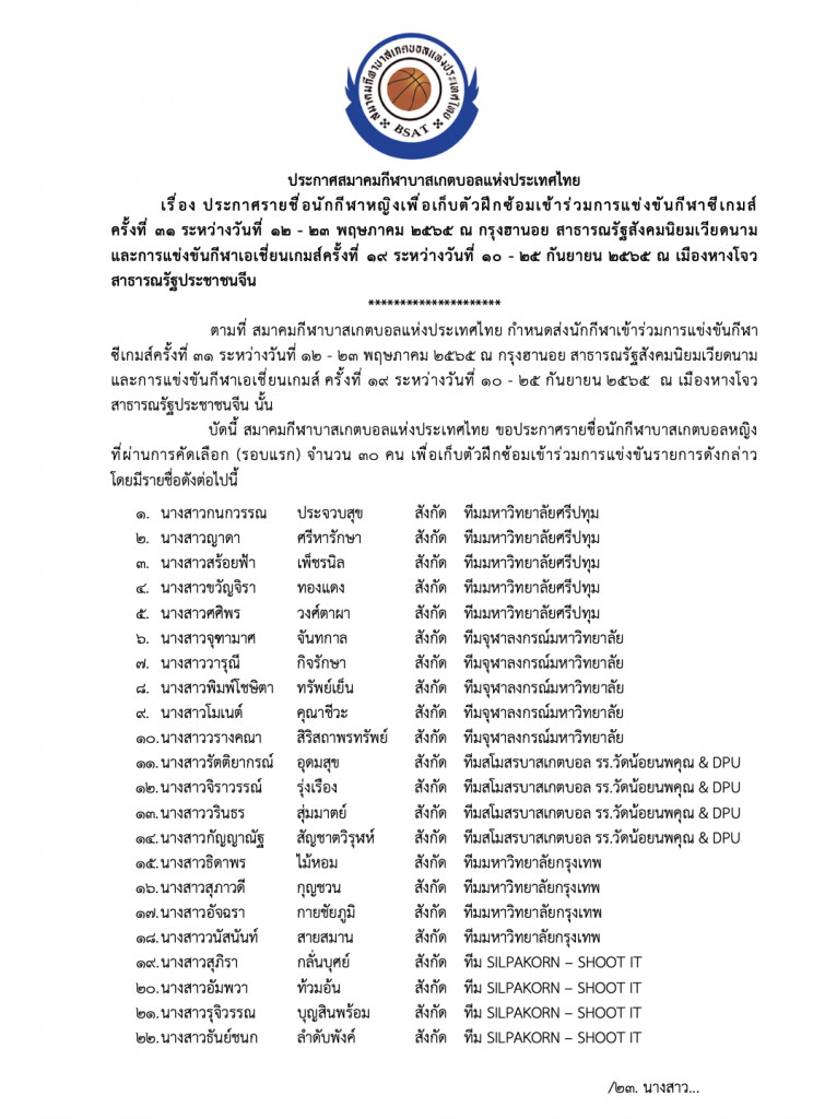 จากการที่ทางสมาคมกีฬาบาสเกตบอลแห่งประเทศไทย กำหนดส่งนักกีฬาเข้าร่วมการแข่งขันกีฬาซีเกมส์ครั้งที่ 31 ระหว่างวันที่ 12-23 พฤษภาคม 2565 ณ กรุงฮานอย สาธารณรัฐสังคมนิยมเวียดนาม และการแข่งขันกีฬาเอเชี่ยนเกมส์ ครั้งที่ 19 ระหว่างวันที่ 10-25 กันยายน 2565 ณ เมืองหางโจว สาธารณรัฐประชาชนจีน นั้น