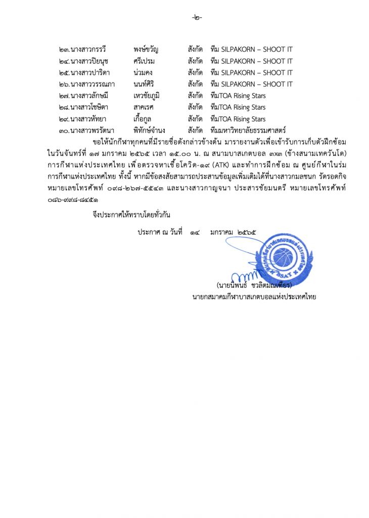 โดยทางสมาคมฯ ขอให้นักกีฬาทุกคนที่มีรายชื่อดังกล่าวข้างต้น รายงานตัวเพื่อเข้ารับการเก็บตัวฝึกซ้อม ในวันจันทร์ที่ 17 มกราคม 2565 เวลา 15.00 น. ณ สนามบาสเกตบอล 3×3 (ข้างสนามเทควันโด) การกีฬาแห่งประเทศไทย เพื่อตรวจหาเชื้อโควิด-19 (ATK) และทำการฝึกซ้อม ณ ศูนย์กีฬาในร่ม การกีฬาแห่งประเทศไทย ทั้งนี้ หากมีข้อสงสัยสามารถประสานข้อมูลเพิ่มเติมได้ที่นางสาวกมลชนก รัดรอดกิจ หมายเลขโทรศัพท์ 098-267-5543 และนางสาวกาญจนา ประสารชัยมนตรี หมายเลขโทรศัพท์ 086-998-8451