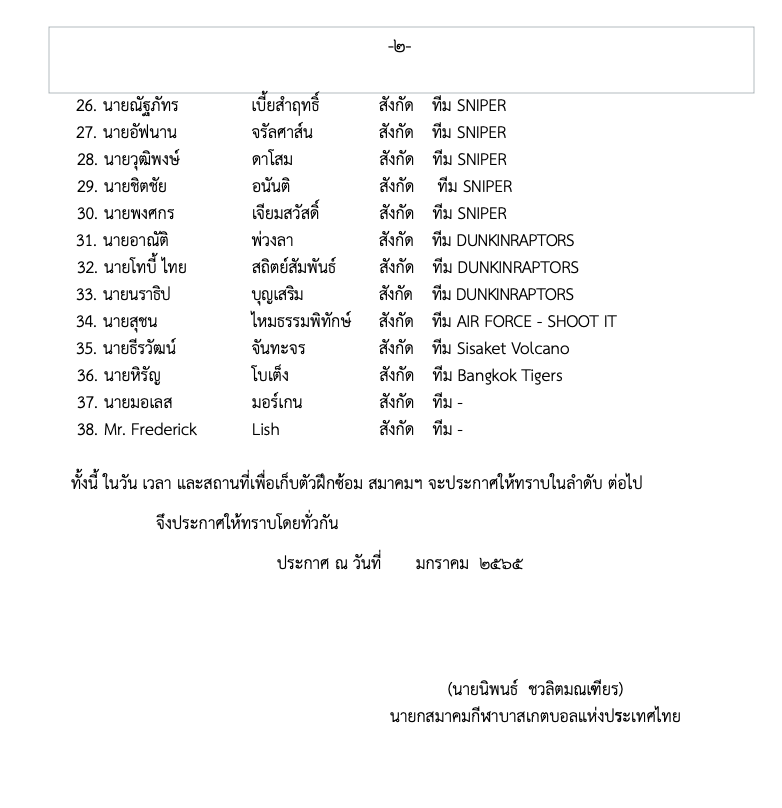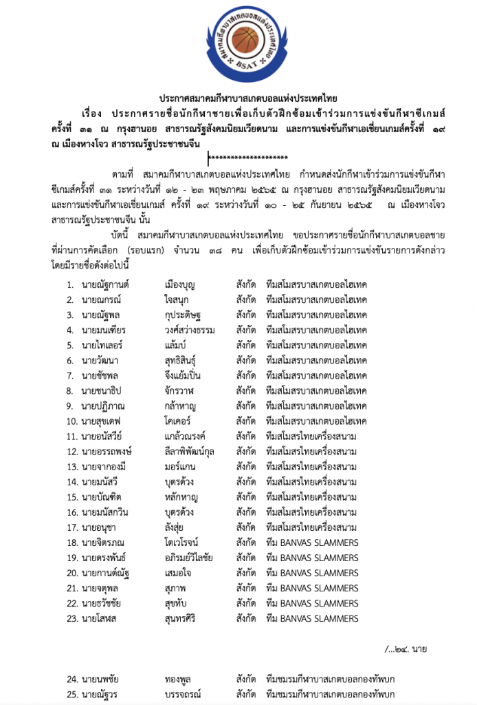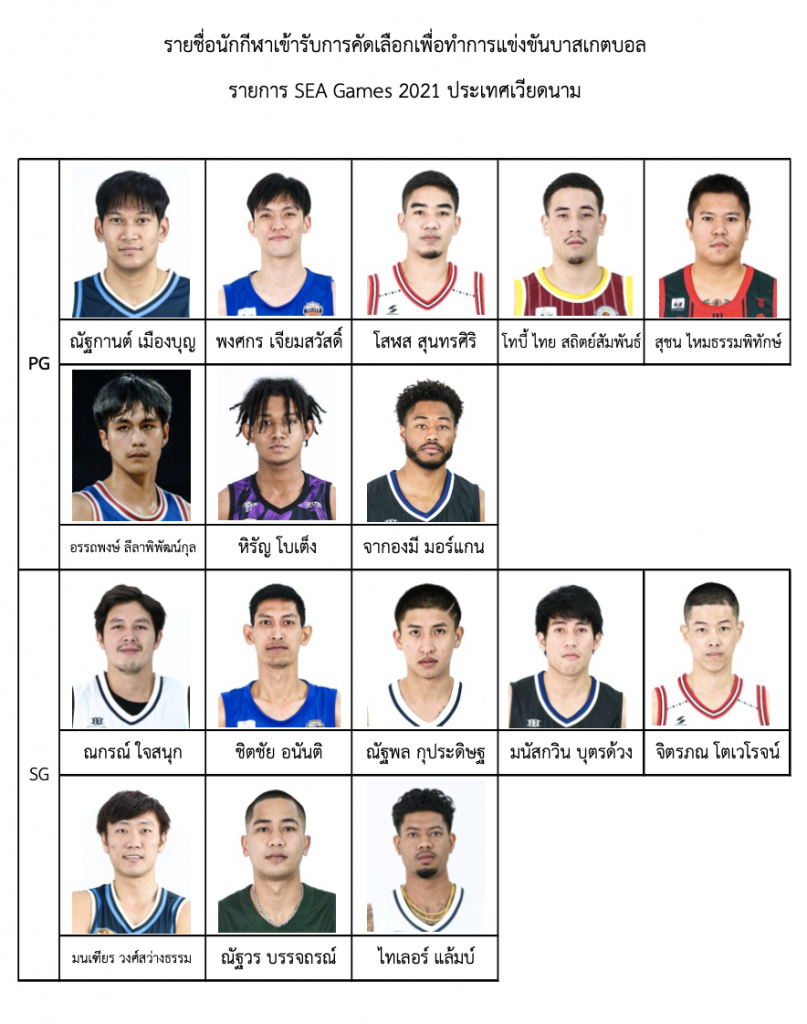 สมาคมกีฬาบาสเกตบอลแห่งประเทศไทย ประกาศรายชื่อนักกีฬาบาสเกตบอลชาย ที่ผ่านการคัดเลือก (รอบแรก) จำนวน 38 คน เพื่อเก็บตัวฝึกซ้อมเข้าร่วมการแข่งขันกีฬาซีเกมส์ครั้งที่ 31 ระหว่างวันที่ 12-23 พฤษภาคม 2565 ณ กรุงฮานอย สาธารณรัฐสังคมนิยมเวียดนาม และการแข่งขันกีฬาเอเชี่ยนเกมส์ ครั้งที่ 19 ระหว่างวันที่ 10-25 กันยายน 2565 ณ เมืองหางโจว สาธารณรัฐประชาชนจีน โดยมีรายชื่อดังต่อไปนี้