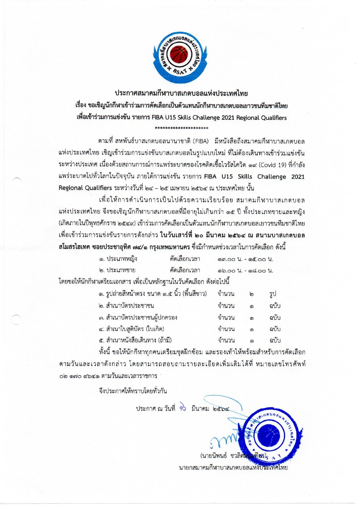 สมาคมกีฬาบาสเกตบอลแห่งประเทศไทย ประกาศขอเชิญนักกีฬาเข้าร่วมการคัดเลือกเป็นตัวแทนนักกีฬาบาสเกตบอลเยาวชนทีมชาติไทย เพื่อเข้าร่วมการแข่งขัน รายการ FIBA U15 Skills Challenge 2021 Regional Qualifiers