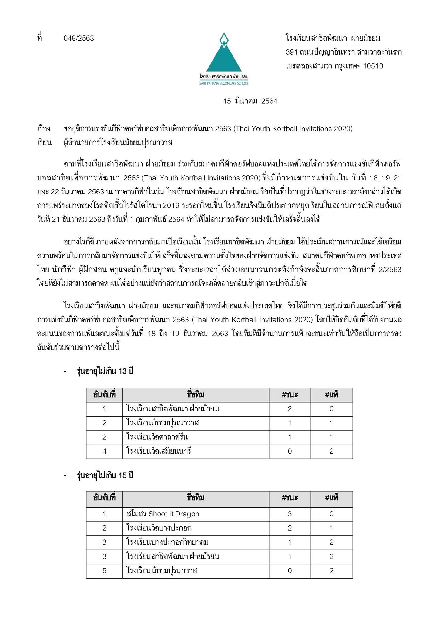 การแข่งขันกีฬาคอร์ฟบอลสาธิตเพื่อการพัฒนา ณ อาคารกีฬาในร่ม โรงเรียนสาธิตพัฒนา โดยทางโรงเรียนสาธิตพัฒนา ฝ่ายมัธยม ร่วมกับ สมาคมกีฬาคอร์ฟบอลแห่งประเทศไทย จัดการแข่งขันรุ่นอายุ 13 ปี 15 ปี และ 18 ปี เมื่อวันที่ 18-19 และ 21-22 ธันวาคม 2563 ที่ผ่านมา ซึ่งเป็นที่ปรากฏว่าในช่วงระยะเวลาดังกลาวได้เกิดการแพร่ระบาดของโรคติดเชื้อไวรัสโคโรนา 2019 ระลอกใหม่ทำให้โรงเรียนมีมติประกาศหยุดเรียน ทำให้ไม่สามารถแข่งขันให้เสร็จสิ้นลงได้ จึงมีมติให้ยุติการแข่งขันโดยยึดอันดับที่ได้รับตามผลคะแนนการแพ้และชนะตั้งแตวันที่ 18-19 ธ.ค.63 ดังนี้